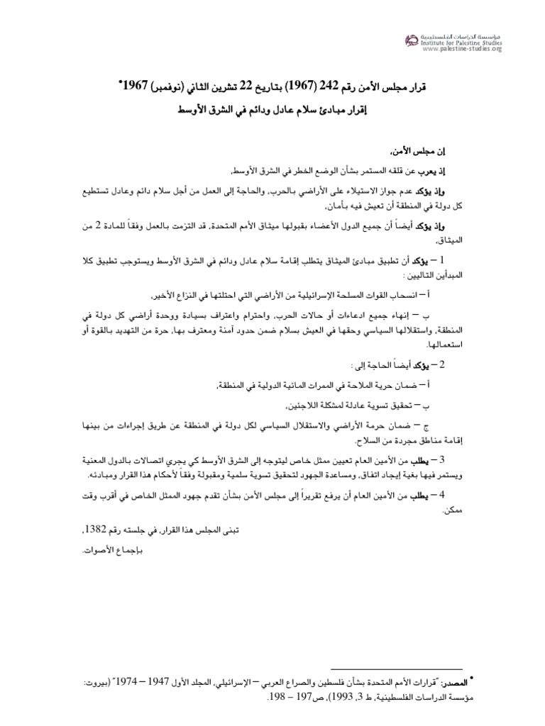 القرار رقم 242 هو قرار أصدره مجلس الأمن الدولي التابع لمنظمة الأمم المتحدة في 22 نوفمبر 1967 ، وجاء في أعقاب حرب 1967 والتي أسفرت عن هزيمة الجيوش العربية واحتلال إسرائيل لمناطق عربية جديدة. مجلس الأمن وإذ يضع في اعتباره مقاصد ومبادئ ميثاق الأمم المتحدة والمسؤولية الأساسية لمجلس الأمن عن صون السلم والأمن الدوليين، وإذ يشير إلى قرارات المجلس السابقة والبيانات الرئاسية ذات الصلة بشأن الدبلوماسية الوقائية والوساطة والحل السلمي، تسوية المنازعات، ويشير إلى اتفاق إعلان المبادئ بشأن مشروع سد النهضة الإثيوبي الكبير، المبرم بين مصر وإثيوبيا والسودان في 23 مارس 2015، وإذ يأخذ علمًا بالمفاوضات التي جرت حول مسألة سد النهضة تحت رعاية الاتحاد الأفريقي: حصلت الجزيرة على مشروع قرار وزعته تونس اليوم الأربعاء في مجلس الأمن بشأن سد النهضة يحث إثيوبيا على الامتناع عن الاستمرار في التعبئة الثانية، فيما جددت أديس أبابا رفضها تدويل قضية السد. قرارات مجلس الأمن من رقم 1500 إلى 1599 وإذ يعيد تأكيد مسؤوليته الرئيسية عن صون السلام والأمن.
